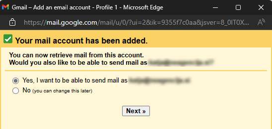 Izberite “Yes, I want to be able to send mail as” in kliknite “Next”: