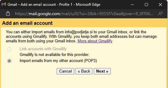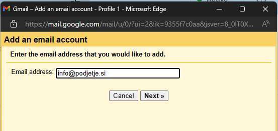 Ker želimo Gmail nastaviti tudi za pošiljanje pošte iz novega e-maila nadaljujemo z nastavitvami.