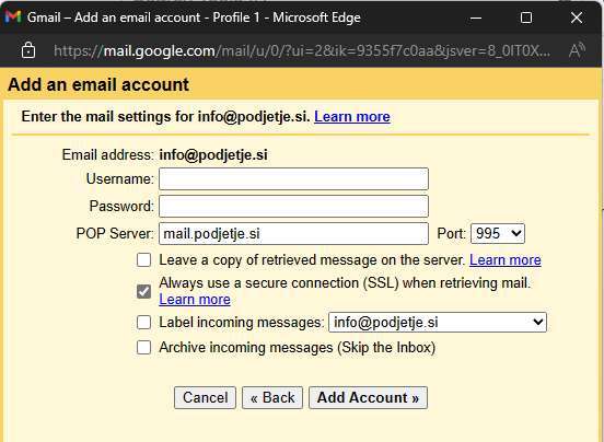 - POP server: se nastavi sam v obliki mail.vasadomena.koncnicadomene, npr. mail.podjetje.si