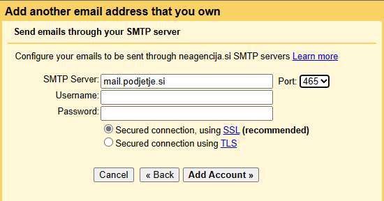 - Username: vaš e-mail naslov, katerega dodajate v Gmail