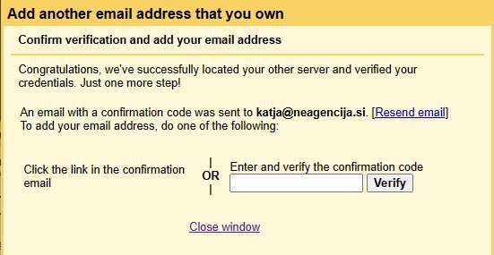 Odpre se okno z obvestilom, da je bil račun uspešno dodan. Sedaj morate le še klikniti povezavo, katero ste dobili na vaš Gmail in potrditi, da ste lastnik Gmail računa katerega boste od sedaj naprej uporabljali za pošiljanje e-pošte iz vaše lastne domene.