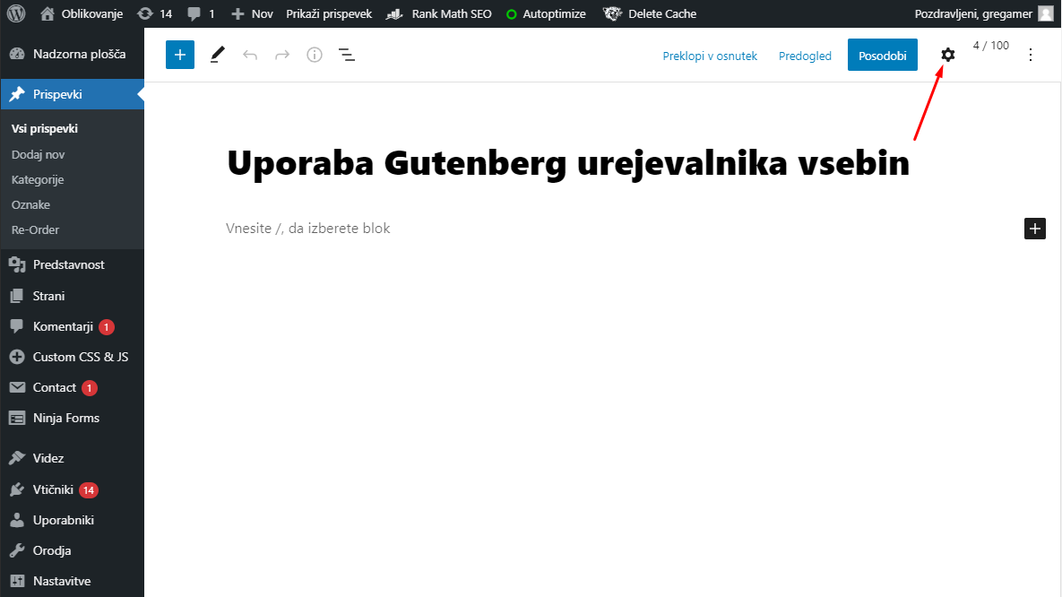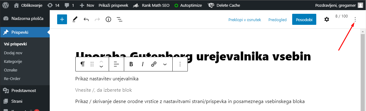 Prikaz / skrivanje desne orodne vrstice z nastavitvami strani/prispevka in posameznega vsebinskega bloka